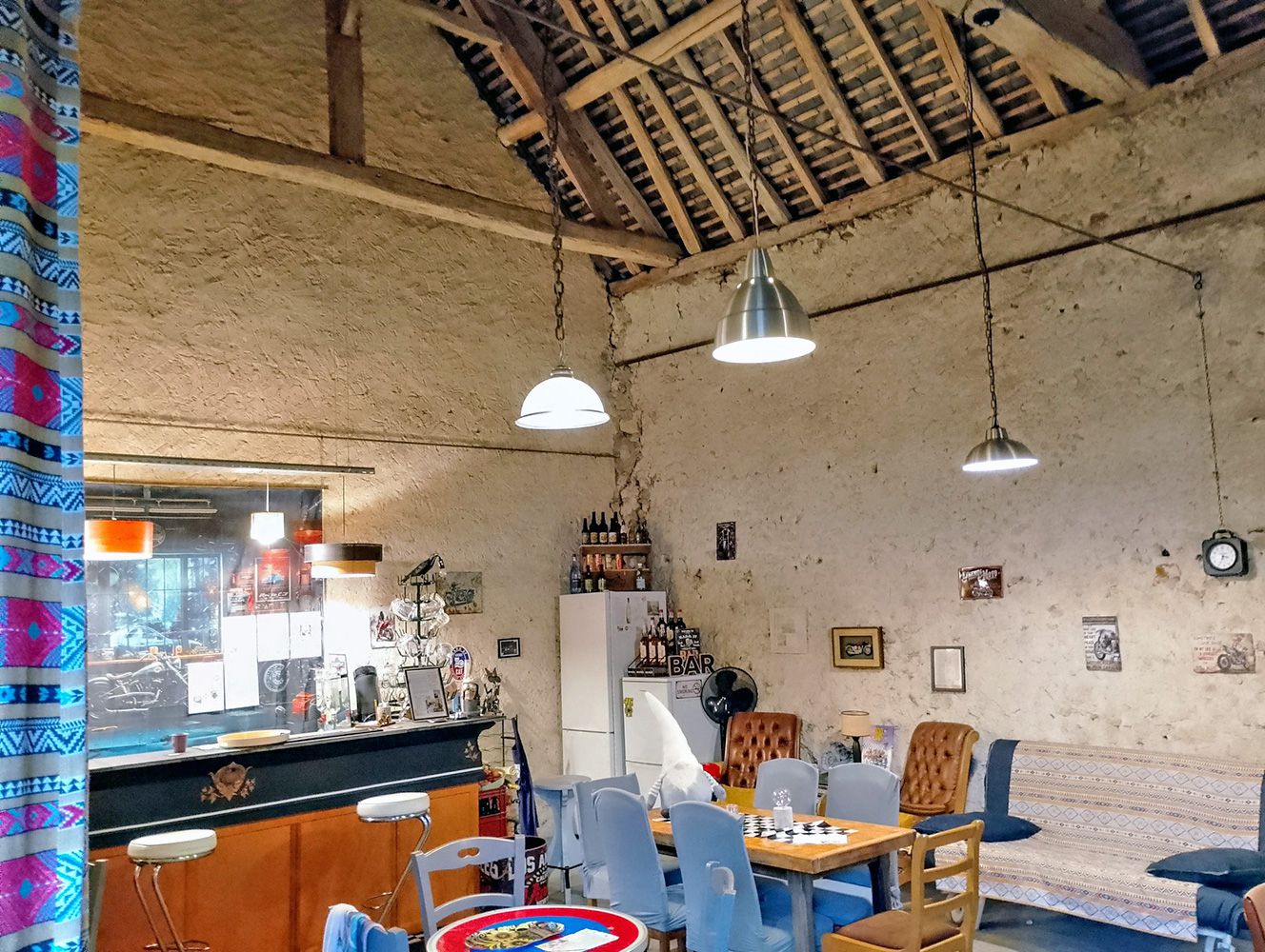 La salle est atypique, dans une ancienne grange, avec déco motarde, jeux de société, revues motardes à disposition, jeu de fléchettes ... de quoi passer de bons moments.